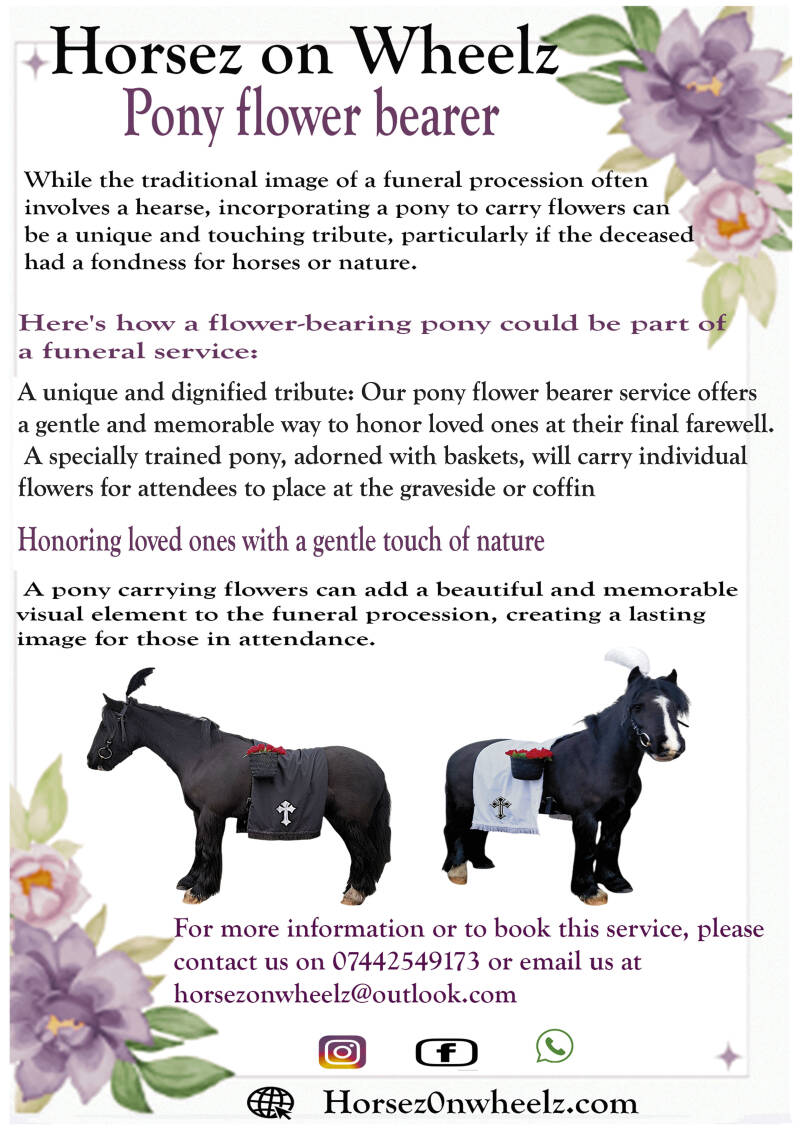 A unique and dignified tribute: Our pony flower bearer service offers a gentle and memorable way to honour loved ones at their final farewell. A specially trained pony, adorned with baskets, will carry individual flowers for attendees to place at the graveside or coffin